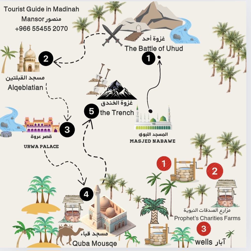 تواصل للحجز رحلة تاريخية + ثقافية، تشمل مرشد سياحي لزيارة المواقع التالية: زيارة أحد وذكر القصة. رحلة لوادي العقيق المبارك....